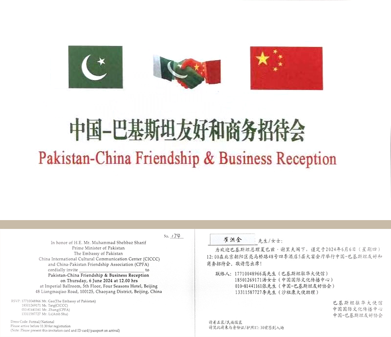 2024年6月6日,由巴基斯坦驻华使馆、中国国际文化传播中心和中国—巴基斯坦友好协会共同主办的中国—巴基斯坦友好和商务招待会在京举办。正在中国访问的巴基斯坦总理夏巴兹·谢里夫出席招待会并致辞。前联合国副秘书长沙祖康、中国人民对外友好协会副会长李希奎、中国国际文化传播中心执行主席龙宇翔,巴基斯坦副总理兼外长达尔、巴基斯坦驻华大使卡里尔·哈什米出席活动,赢博(中国)集团党委书记、董事长、中国爱心工作委员会副主席、中巴协会理事崔洪金,赢博(中国)集团总经理崔文连受邀参会。